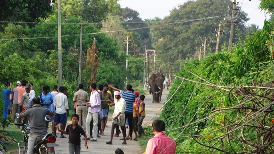 A youth runs as a tusker was spotted at Beechanahalli village in Mysuru district on Friday. ( Photo by Beechanahalli...