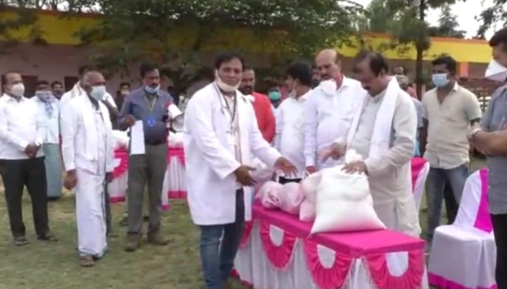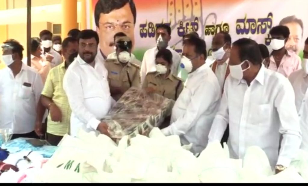 Mandya: Followers of B Y Vijayendra, Karnataka State General Secretary, Yuva Morcha, BJP and district incharge minister Narayan Gowda distributed...