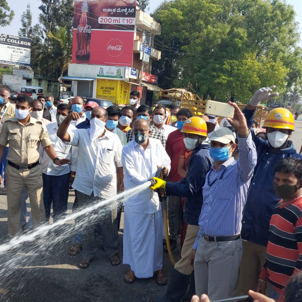 Mysuru: Former minister and Chamundeshwari MLA G T Devegowda launched the drive of spraying disinfectant at Srirampura outer-ring road junction...