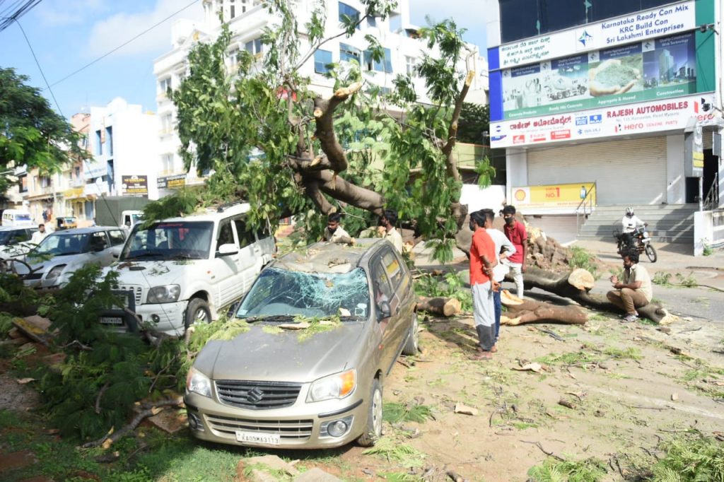 Mysuru: Three cars were damaged after a tree collapsed and fell on them on Ramavilas road in the city on...