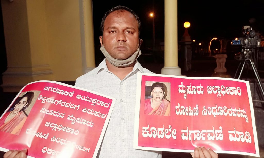 Mysuru: Heaping praises on MCC Commissioner Shilpa Nag, Corporator Lokesh Piya staged a lone protest demanding the transfer of Deputy...