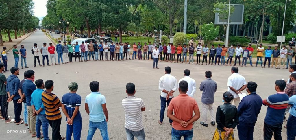 Mysuru: Expressing solidarity with Bharat Bandh, University of Mysore Research Students Association formed a human chain near Clock Tower in...