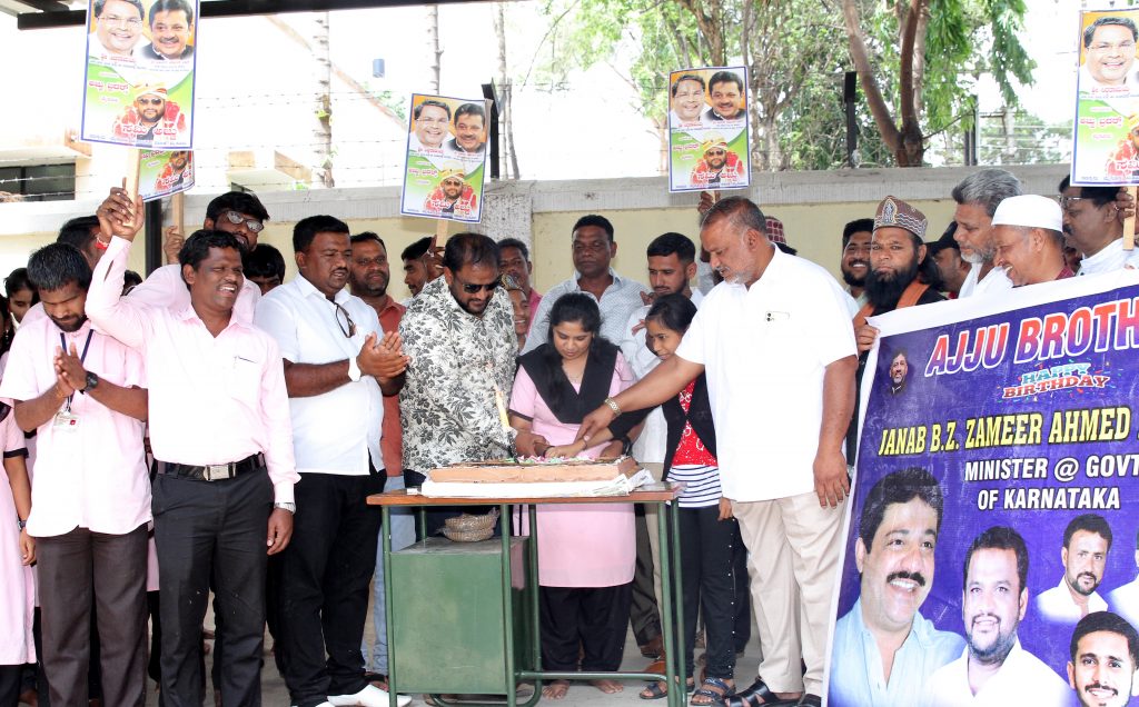 Mysuru: Supporters of Housing Minister B Z Zameer Ahmed, known as Ajju Brothers, celebrated Zameer Ahmed's birthday by cutting cake...