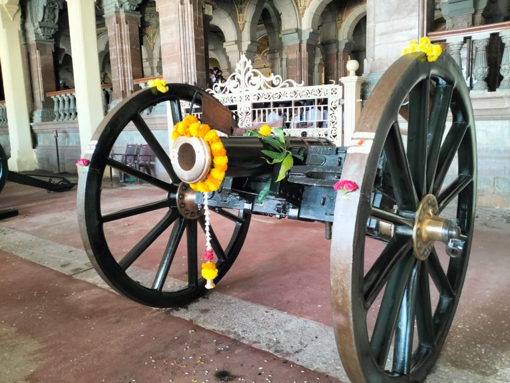 Mysuru: A traditional puja was offered to 11 canons of Mysore Palace in front of Aane Bagilu (Elephant Gate) entrance...