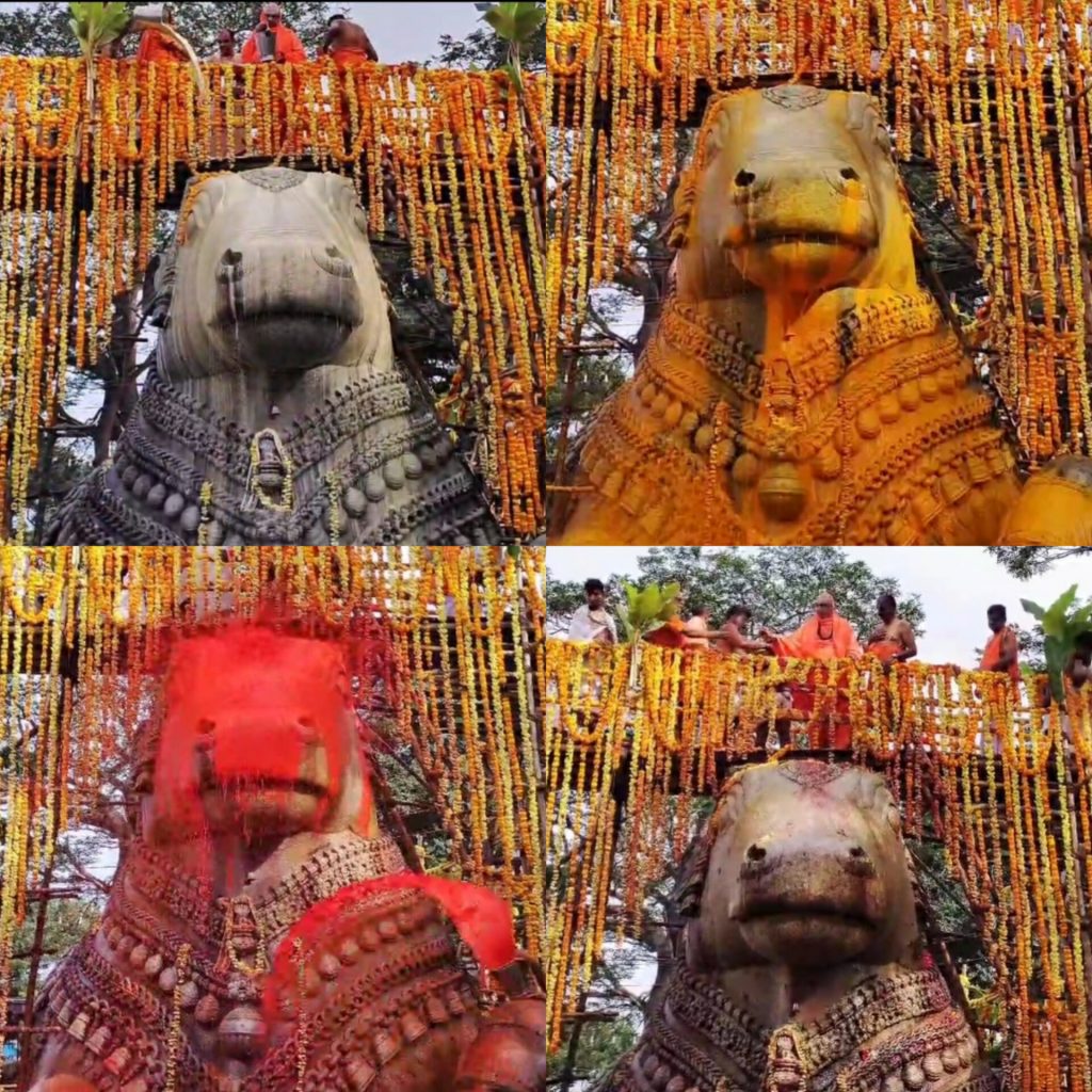 Mysuru: Nandi statue at Chamundi Hill turned colourful, during the Mahabhisheka on Sunday. Bettada Balaga an association of regular walkers...