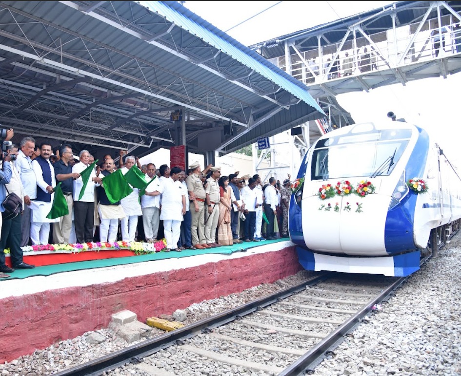 Haveri: V Somanna, Union Minister of State for Railways and Jal Shakti, flagged off Train No. 20662 Dharwad–KSR Bengaluru Vande...