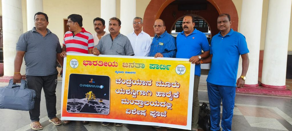 Mysuru: Members of Mysuru BJP unit will offer a special puja for the success of historic Chandrayaan – 3 Mission. A team of 82 BJP leaders have left the City by train on Tuesday and will offer prayers at Mantralaya on Wednesday.