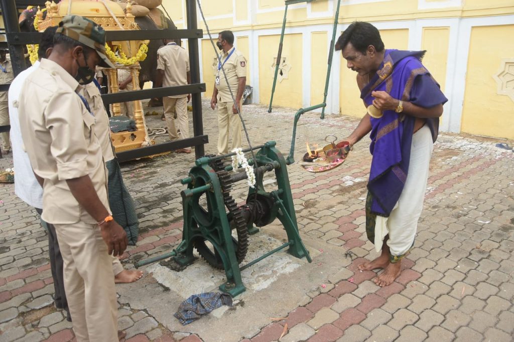 Prior to the practice with wooden howdah, traditional puja was performed including to the pulley used to lift the howdah and mount on the elephants.