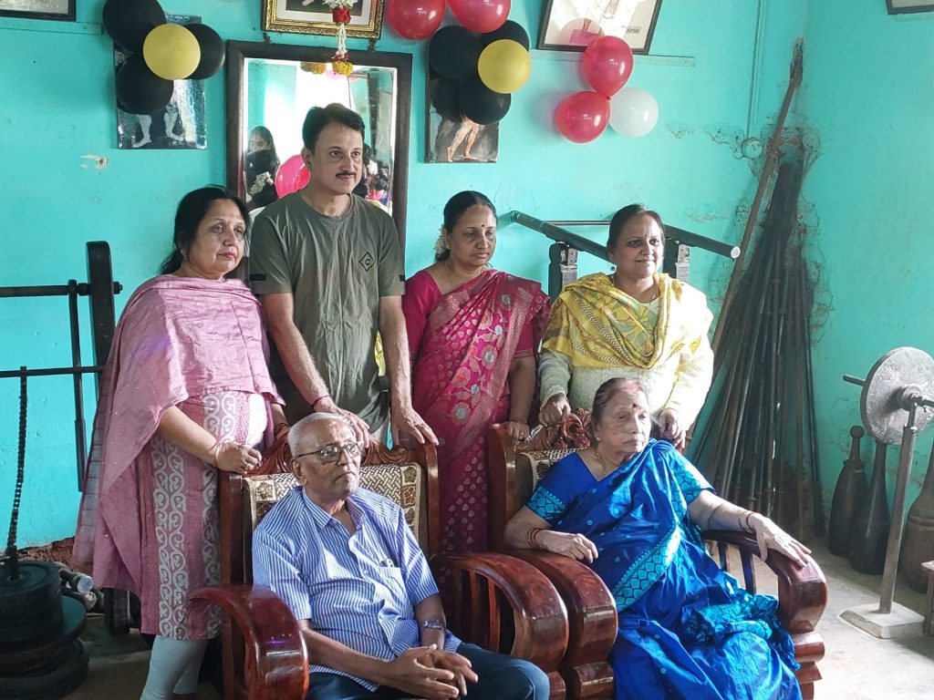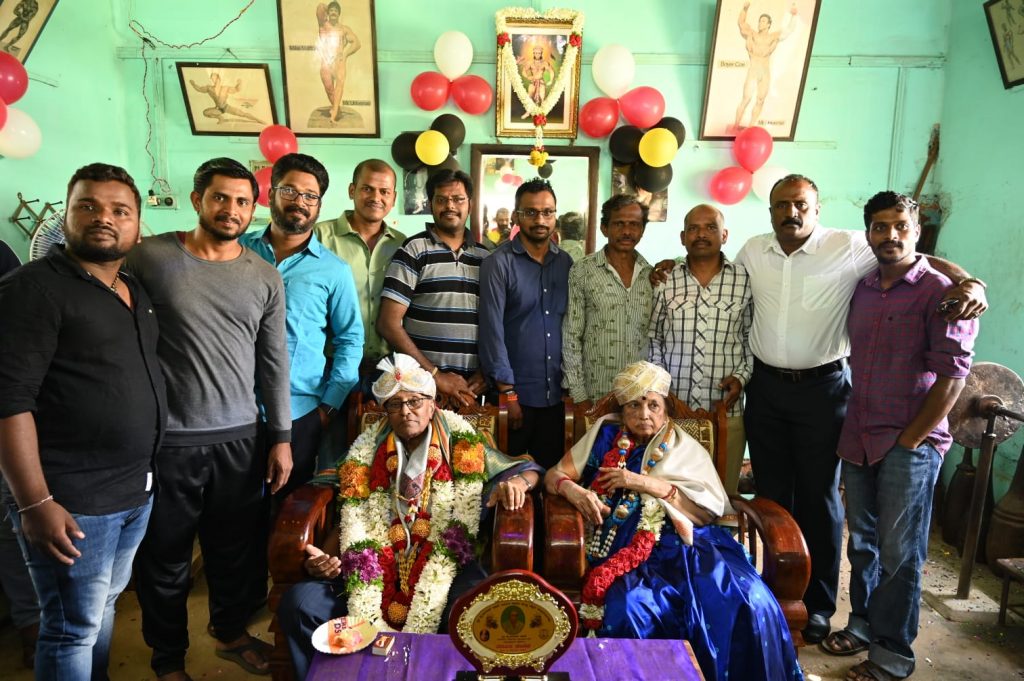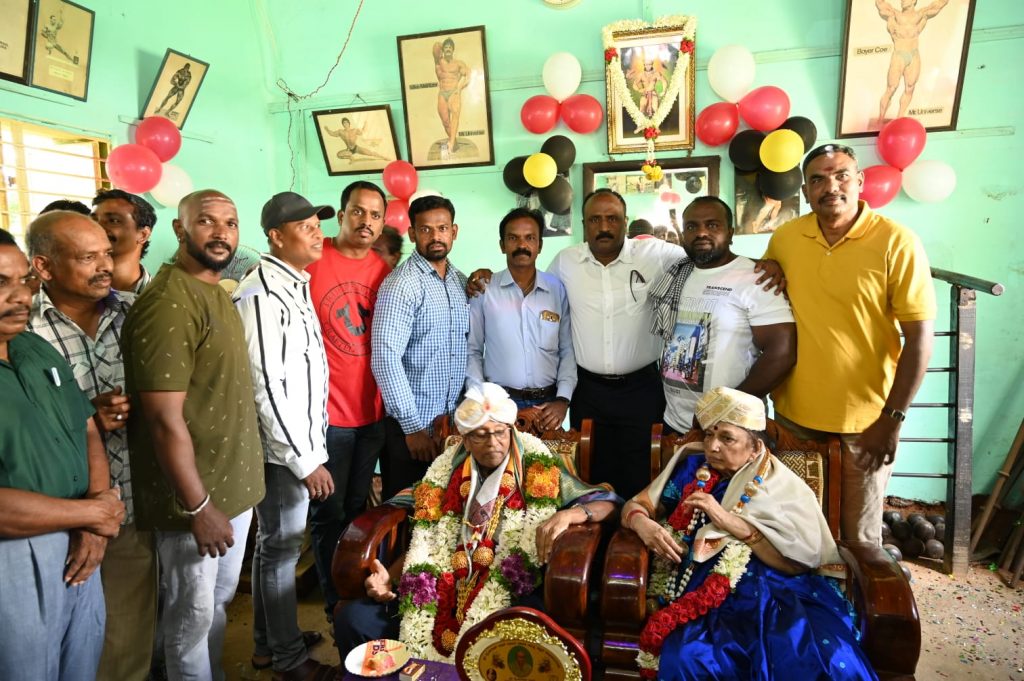 The gym members who have been regularly practicing for many years decorated the main hall of the gym with colourful balloons and yelled in joy, as Rao cut the birthday cake and honoured him and his wife Gayatri N with Mysore Peta, a traditional headgear and garland.