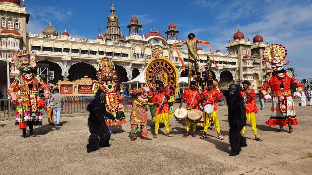 Cultural troupes like that of Veeragase, Kilugombe, Maragalu (stilt walking), Chande and Tamate troupes also took part. Flower petals were offered to wooden howdah and canon firing was conducted in the background followed by the rendition of National Anthem.