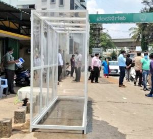 Bengaluru: Bruhat Bengaluru Mahanagara Palike’s (BBMP) first of its kind disinfectant tunnel has been installed at APMC Market in Yeshwanthpur. It is a initiative of SadaSmitha Foundation led by Union Minister D V Sadananda Gowda.