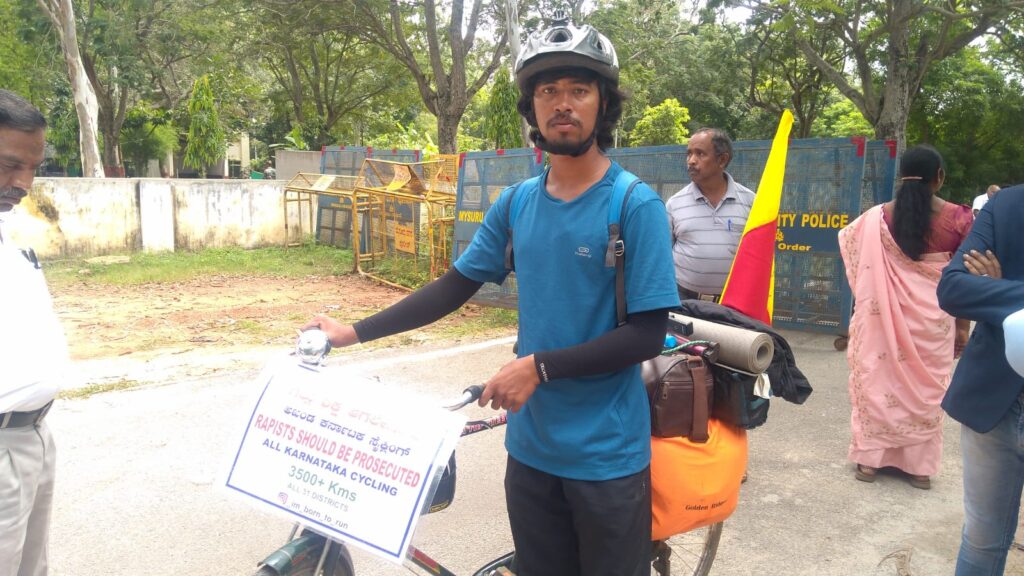 Mysuru: A marathon runner from Bengaluru is on a bicycle expedition to add power to the fight against sexual assaults...