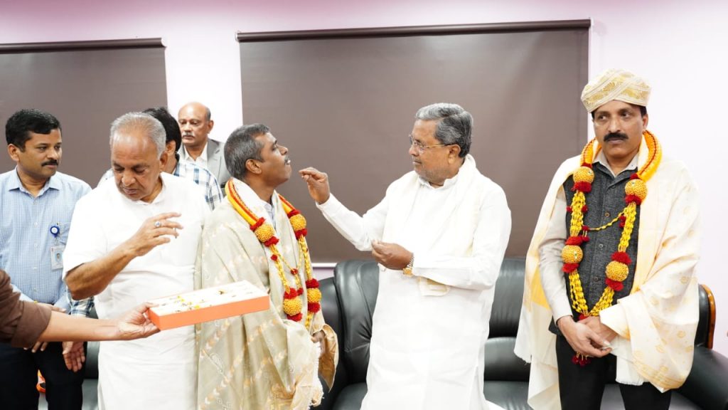 He felicitated ISRO chief S Somanath by presenting him with a Mysore Peta, traditional garland and some sweets. He honoured other scientists and shared sweets with them too.