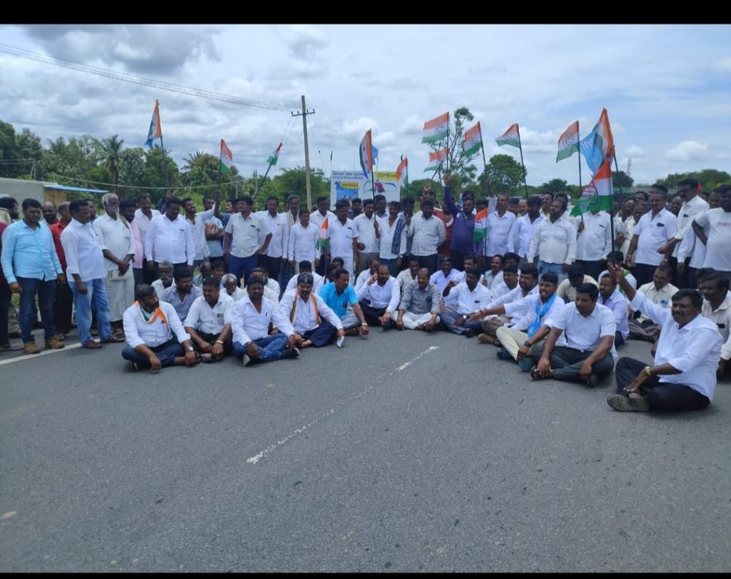Mysuru: Strongly condemning the incident of throwing egg on the car of Opposition Leader Siddaramaiah recently in Madikeri, Congress workers staged a road block protest at Varuna gate on Mysuru- T Narsipur road on Tuesday.