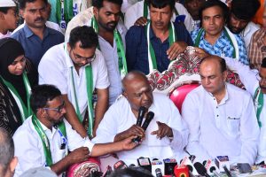 During his visit to Syed Masan Shah Khadri’s residence in Tippu Nagar, Channapatna, Deve Gowda sought support for his grandson, Nikhil Kumaraswamy, who is contesting in the by-election from Channapatna as NDA candidate.