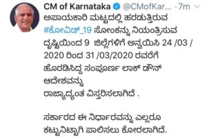 Bengaluru: It’s official. Ending speculations Chief Minister B S Yediyurappa has announced complete lockdown in the state till March 31.