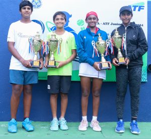 Doubles winners (from left) Yash Kumar, Aarav Chhallani and Padmapriya Ramesh Kumar and Jahnavi Tammineedi.