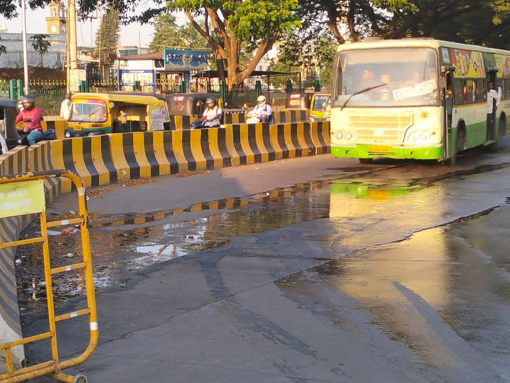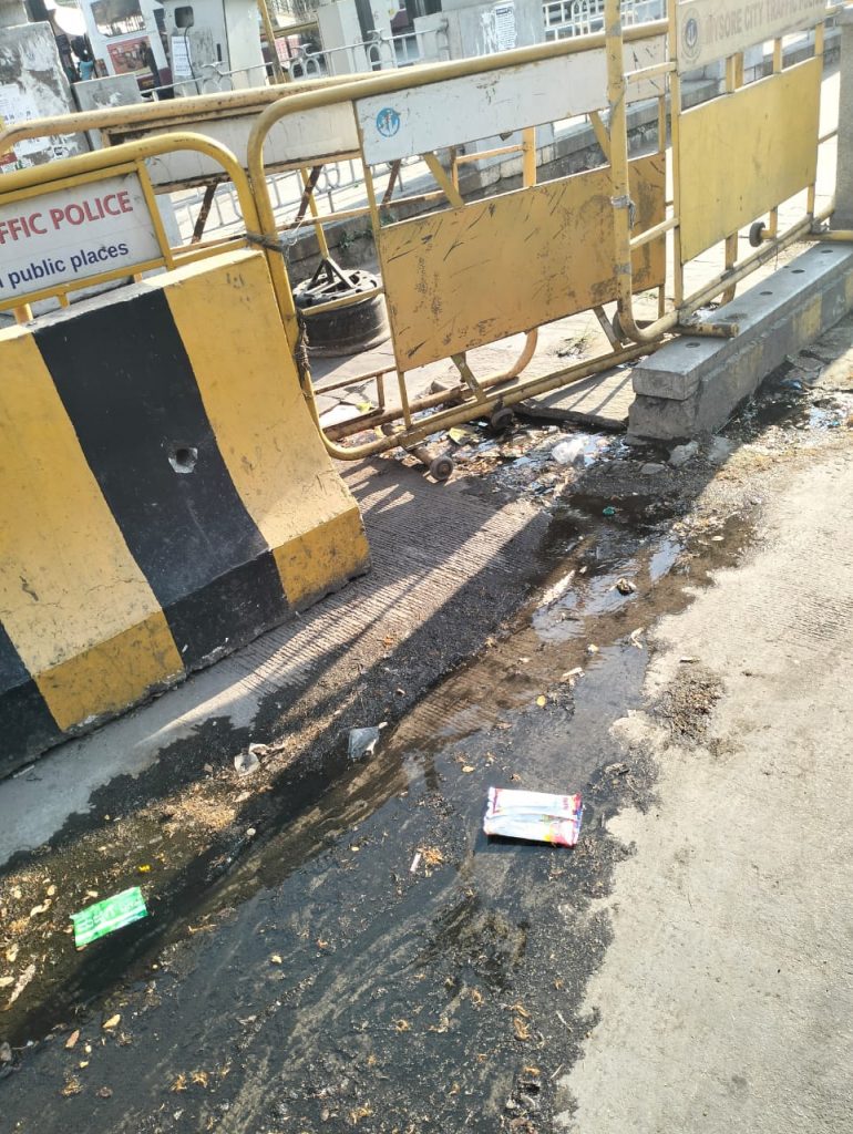 Mysuru: The KSRTC City bus stand – on Friday – literally resembled a cesspool with sewage water flowing all over the bus stand, leaving the commuters to bear the foul smell and what not!