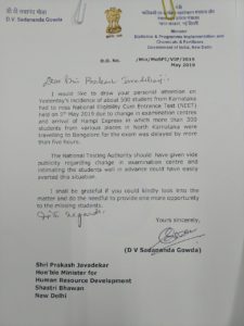 Bengaluru: Union Minister of State for Statistics and Programme implementation D V Sadanada Gowda has written to Union Human Resources Development ( HRD) Minister Prakash Javadekar to conduct re-examination for those candidates who missed national eligibility cum entrance test ( NEET) on Sunday.