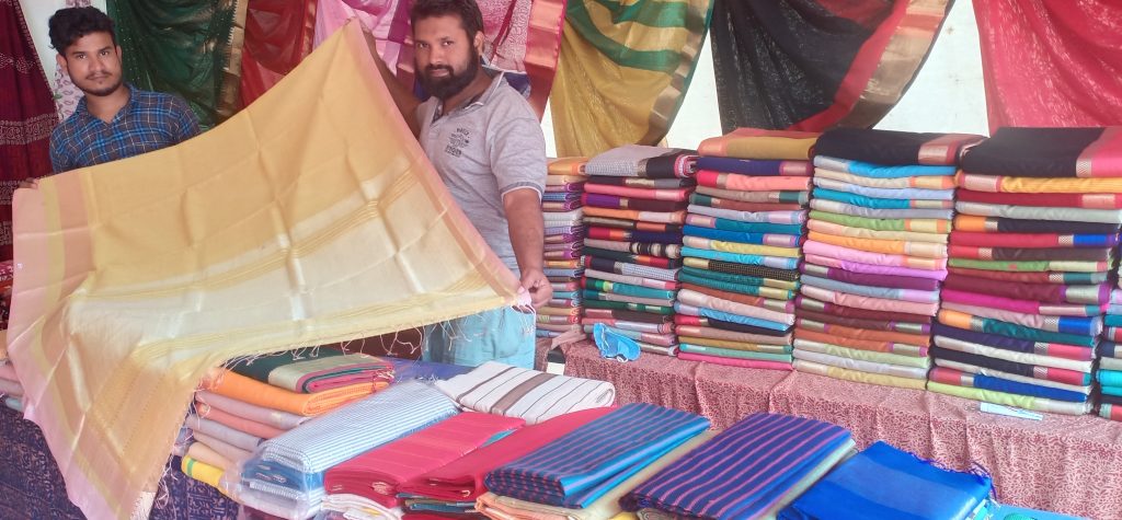 Varieties of sarees like that of silk saree, iIlkal saree, Kanjivaram of Tamil Nadu, Tasha saree from Bihar, Chanderi and Maheshwari from Madhya Pradesh, Sambhalpuri from Odisha, Pashmina Shawl from Kashmir, Godhwal saree from Andhra Pradesh, Patel saree from Gujarat and of many other States irrespective of Silk and Cotton sarees are on sale.