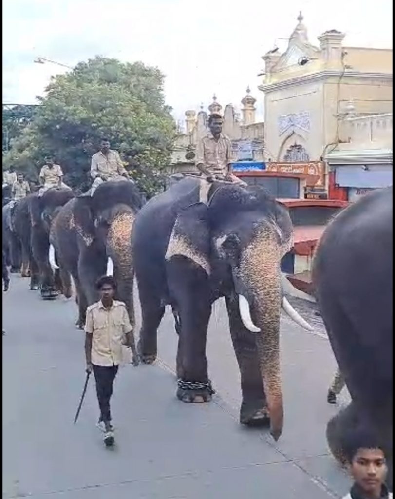 Mysuru: The Dasara elephants are getting accustomed to their long march amidst the hustle-bustle of the City to prep for the Jamboo Savari procession. As part of their practice, they walk for 9.5 kilometers covering the Raja Marga.