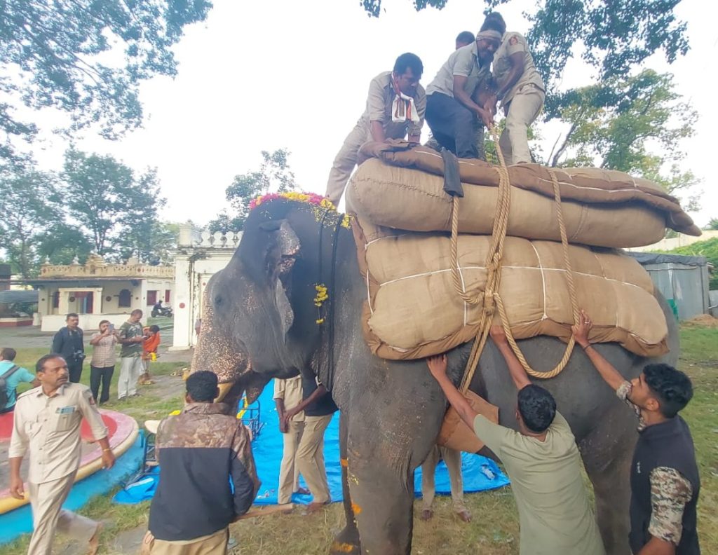 Mysuru: Dasara howdah elephant Abhimanyu led team of elephants commenced weight training with sandbags on Raja Marga, the jamboo savari...