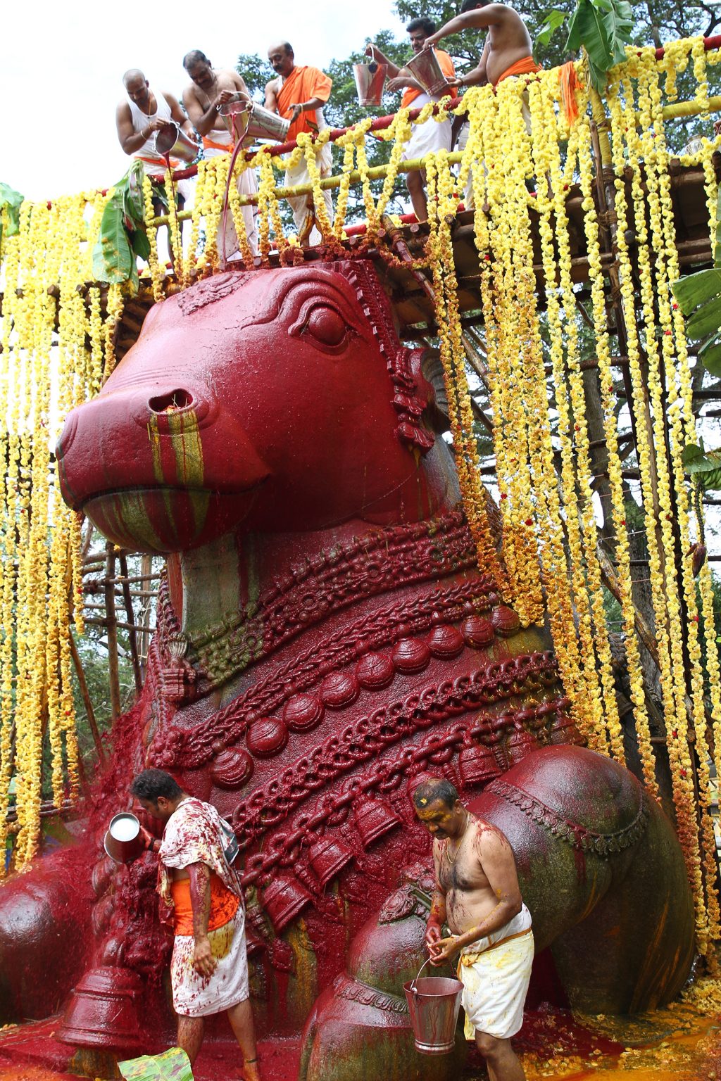 Mysuru: Nandi statue at Chamundi Hill turned colourful, during the Mahabhisheka on Sunday. Bettada Balaga an association of regular walkers...