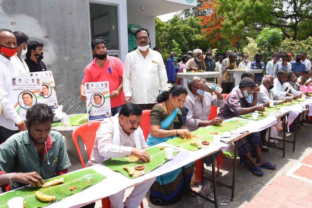 Mysuru: Congress party workers on Saturday hosted lunch on plantain leaves for the destitutes as part of 51st birthday celebration...