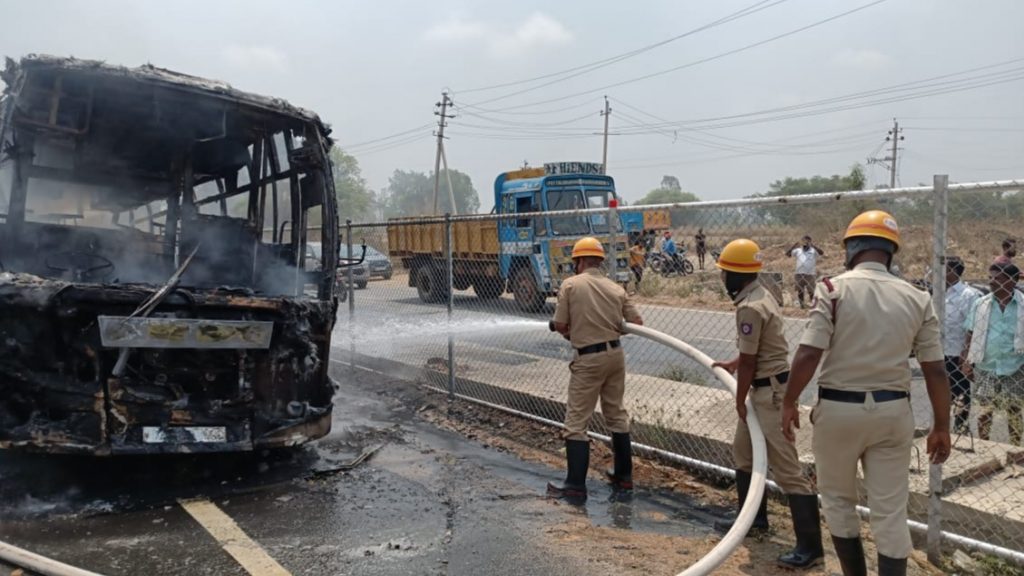 Mandya: A Volvo bus carrying wedding party to Mysuru was totally gutted in fire near Ganangur of Srirangapatna taluk on...