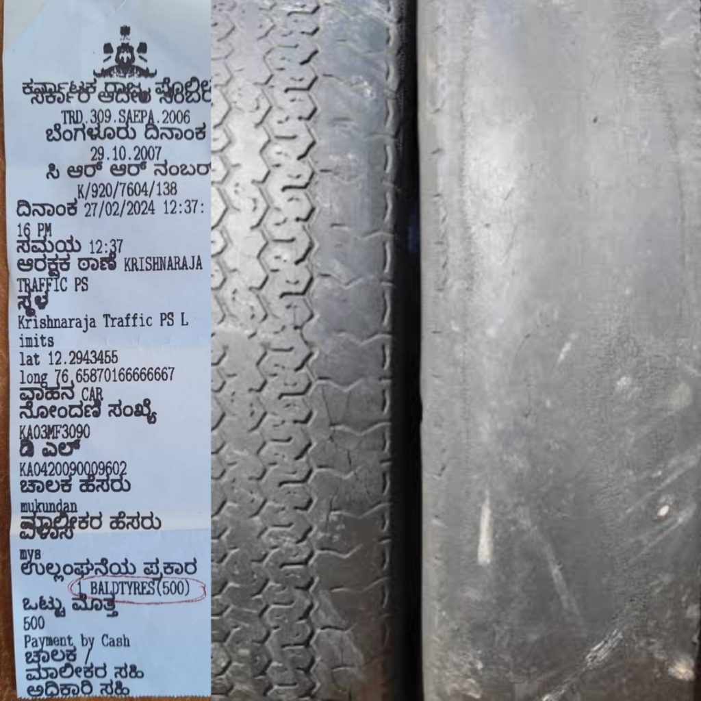 Mysuru: In a rare case, Krishnaraja Traffic Police have imposed a fine on a car driver for the bald tyre...