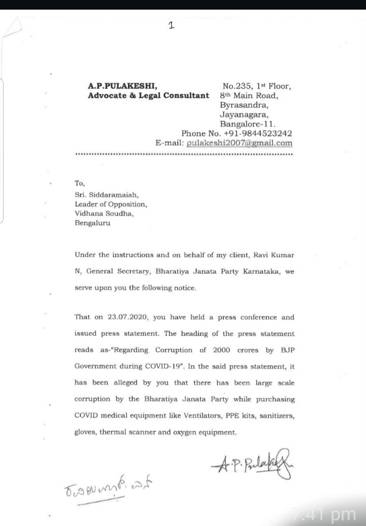 Bengaluru: Following the legal notice served by a BJP MLC over the allegations of Rs 2000 crore scam in Covid-19,...