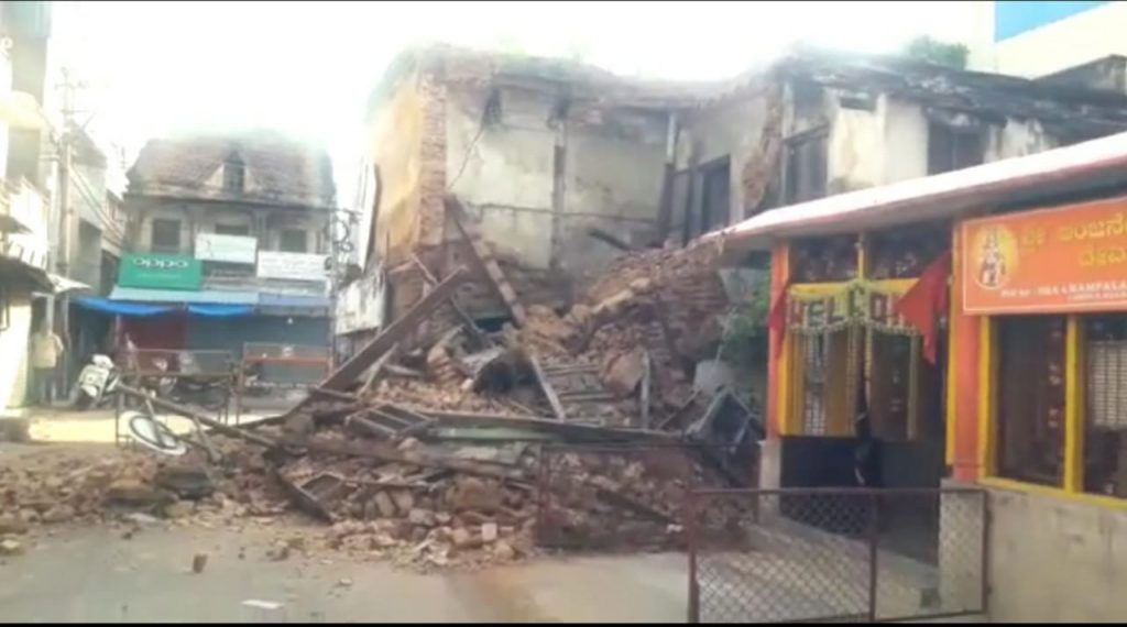 Mysuru: A dilapidated building came crashing down on the road between D Devaraja Urs road and Shivarampet on Thursday wee...