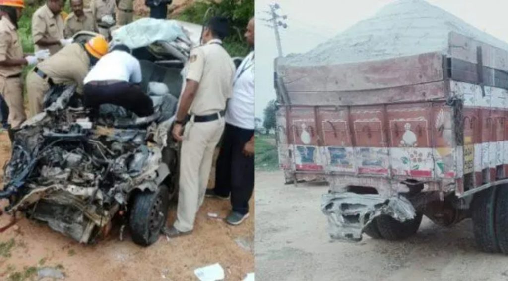 Mandya: Four persons were killed on the spot after their car hit a lorry from the rear side near Tirumalapura...
