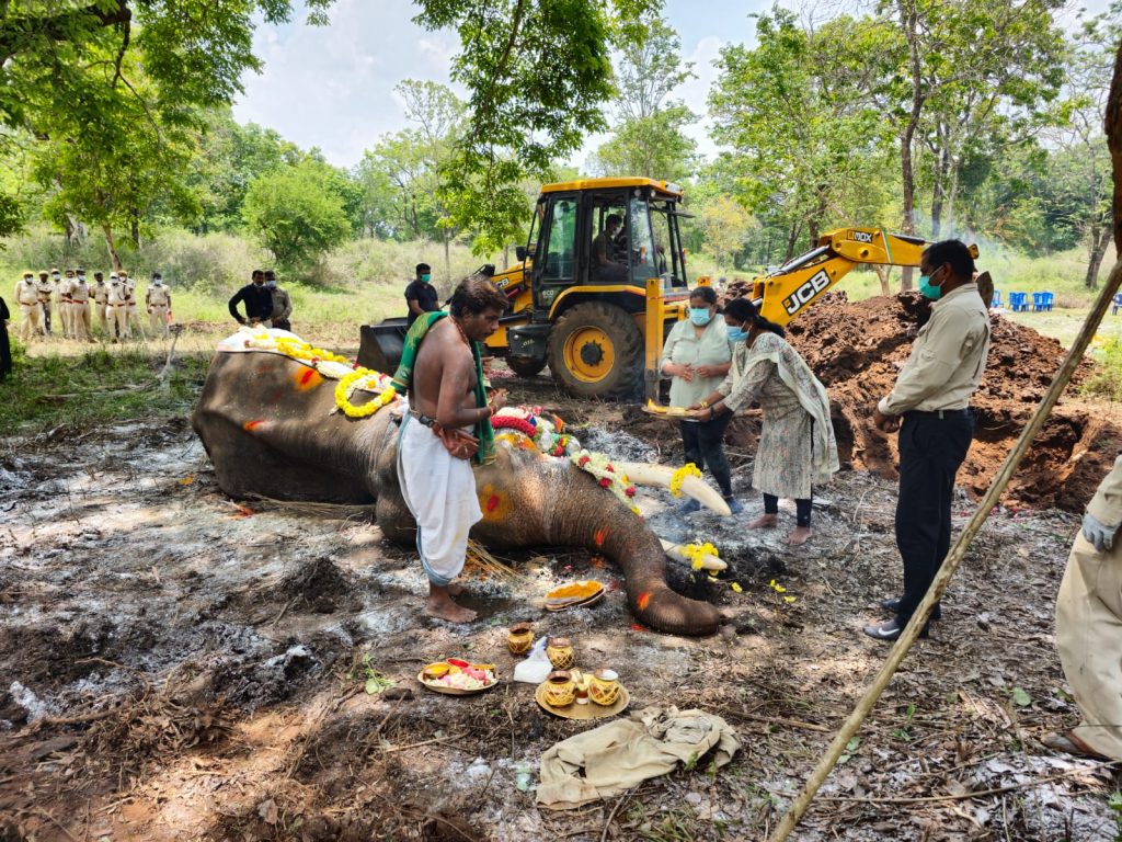 Mysuru: Balarama, veteran Dasara jumbo, who died on May 7 was laid to rest with State honours at Karekatte Forest...
