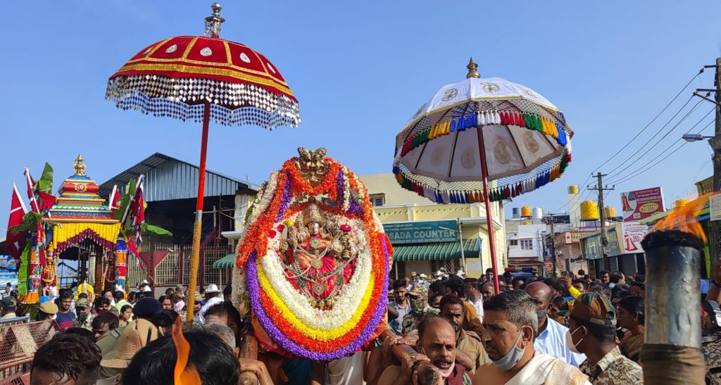 Mysuru: Rathotsava (car festival) of Goddess Chamundeshwari at Chamundi Hill was conducted on Tuesday. Idol of Goddess Chamundeshwari decorated as...