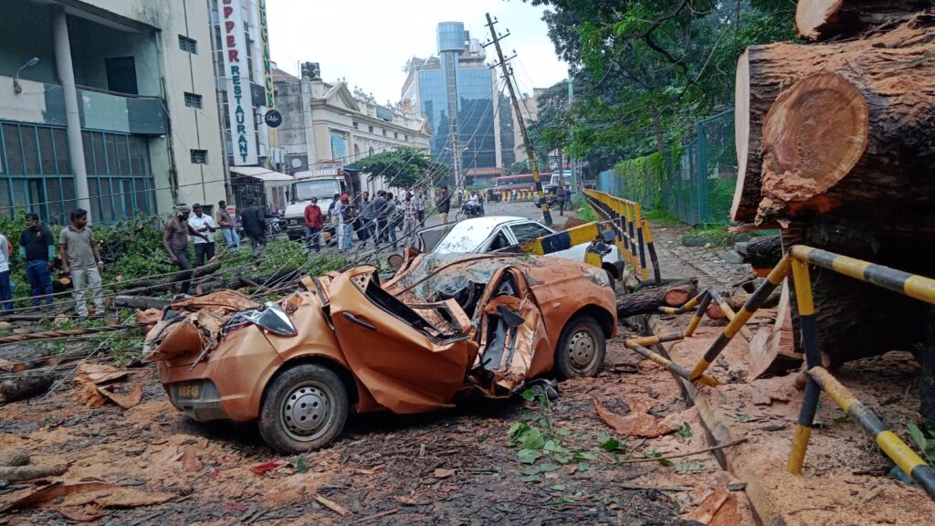 Mysuru: Following heavy rains in the recent days, an heritage tree at a park uprooted, damaging electric line and cars...