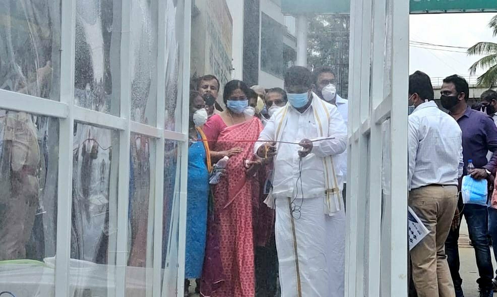 Bengaluru: Bruhat Bengaluru Mahanagara Palike's (BBMP) first of its kind disinfectant tunnel has been installed at APMC Market in Yeshwanthpur....