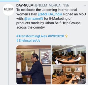 As a inapt gift for women in SHGs for International Women’s Day on March 8, the ministry entered into an agreement with Amazon for e- marketing of products made by Urban self- help groups across the country.