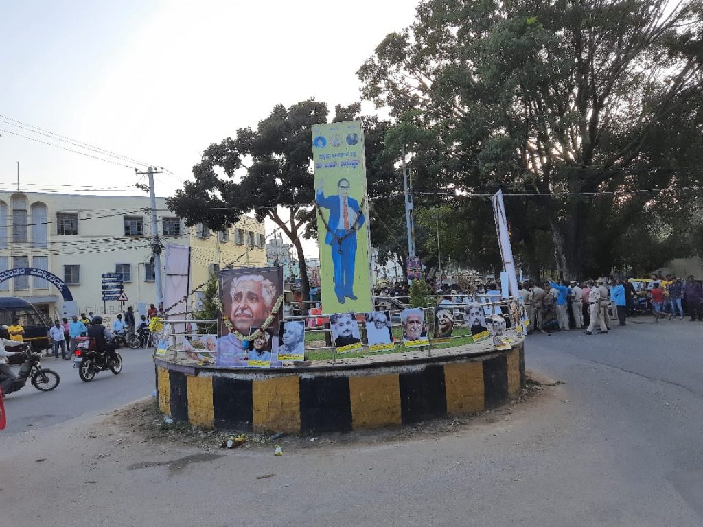 Mysuru: As the two separate groups insisted on installing the statues of Constitution expert Dr B R Ambedkar and poet laureate Kuvempu at Mathrumandali Circle island in V V Mohalla in the city respectively, police demolished the circle structure to avoid any recurring tension on Thursday.