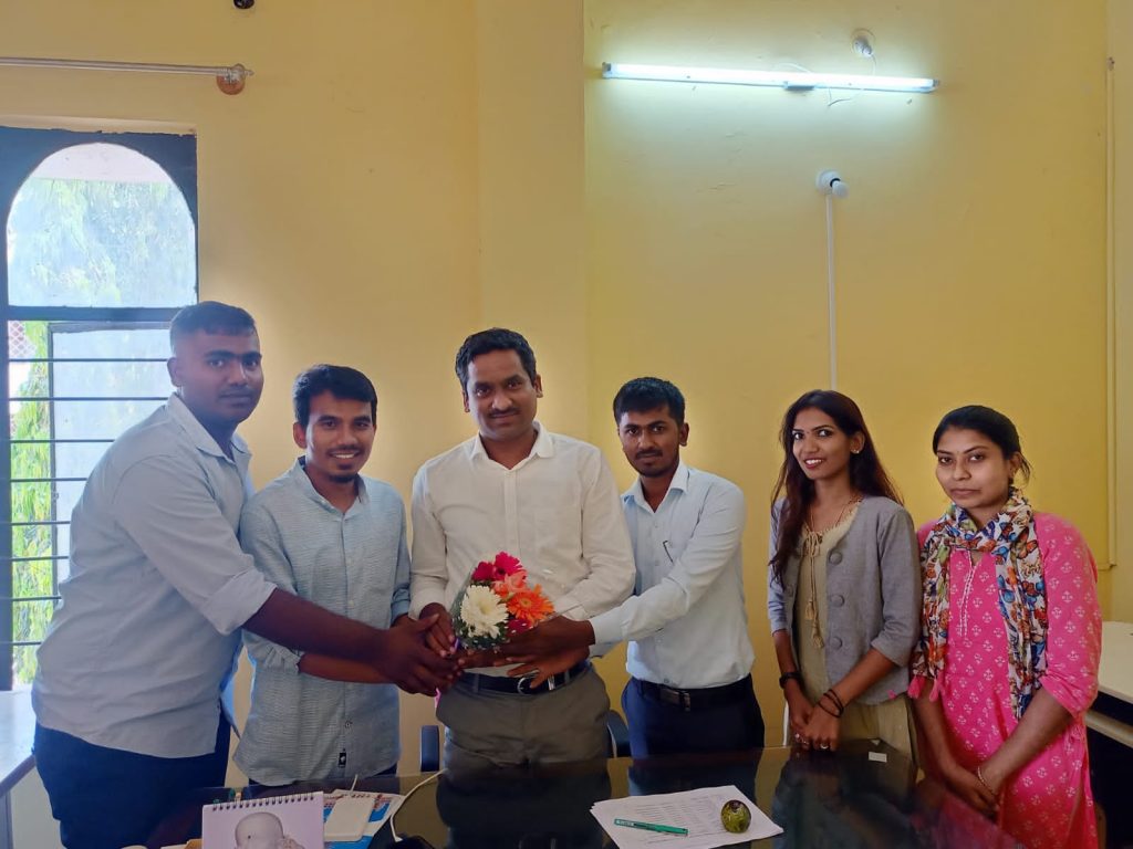 Senior Research scholar Abhishek N greeted the official with a bouquet.