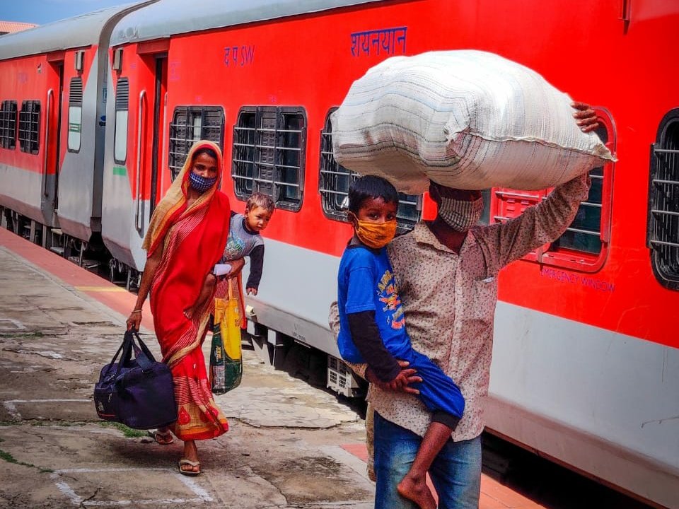 A man carries luggage, with his child to board Shramik Express Train at Ashokapuram railway station in Mysuru.