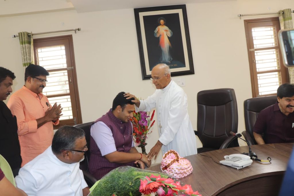 Mysuru: Yaduveer Krishnadatta Chamaraja Wadiyar, scion of erstwhile royal family of Mysuru and BJP candidate of Mysuru- Kodagu Lok Sabha constituency called on Apostilic Administrator of Mysuru Diocese Bishop Bernard Moras at Sanmargi, the Bishop House in Bannimantap on Monday.